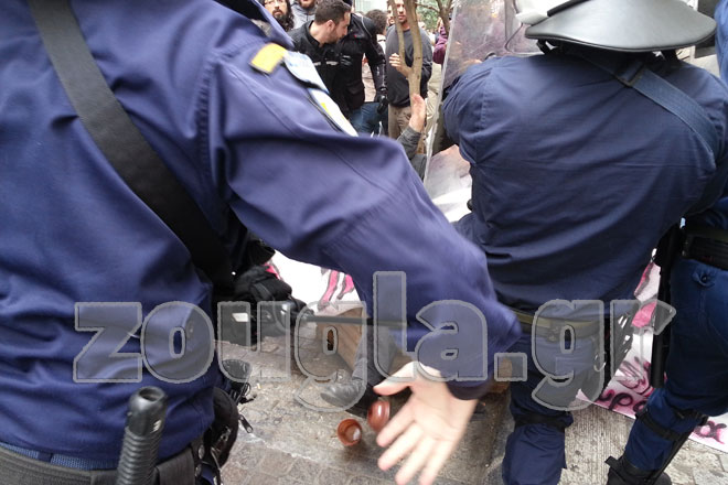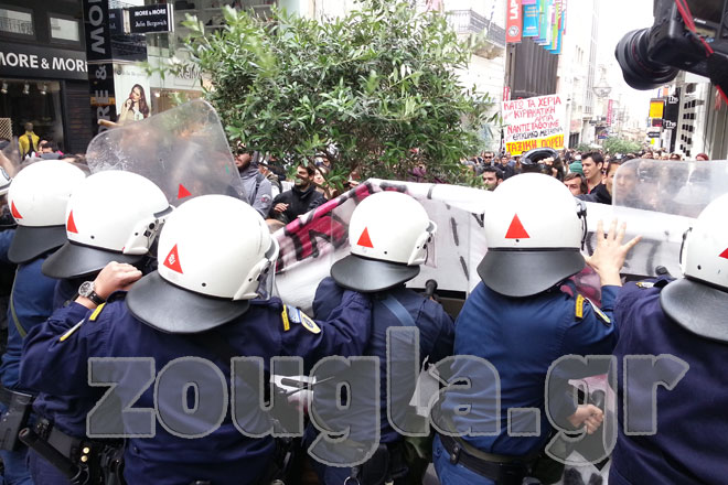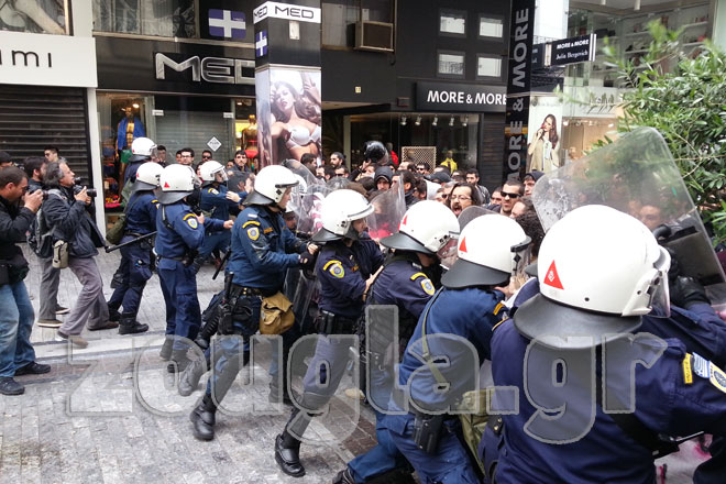 Αντεγκλήσεις σημειώθηκαν μεταξύ διαδηλωτών εμποροϋπαλλήλων που διαμαρτύρονται για το άνοιγμα των καταστημάτων, και δυνάμεων των ΜΑΤ που τους ζήτησαν να αποχωρήσουν.