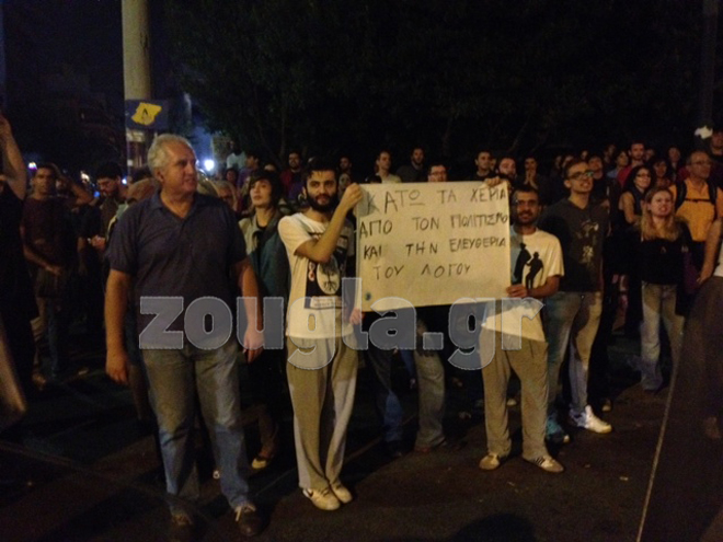 (Η συγκέντρωση των μελών των παραθρησκευτικών οργανώσεων και πολιτών που αντιδρούν στην παράσταση στις 21.30)