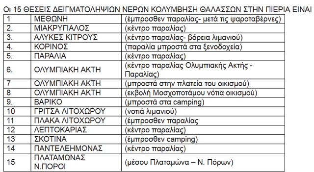 Τα αποτελέσματα και των τελευταίων αναλύσεων επιβεβαιώνουν την εξαιρετική ποιότητα των νερών κολύμβησης σε όλες τις ακτές της Π.Ε. Πιερίας , παρόλο που οι έλεγχοι διενεργούνται σε περίοδο αιχμής με αυξημένο αριθμό λουομένων στις ακτές της με τα ξενοδοχεία και τα ενοικιαζόμενα δωμάτια να βρίσκονται σε λειτουργία.
