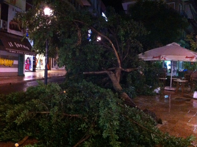 Προβλήματα στην κυκλοφορία σημειώθηκαν και στην περιοχή «Πεταλούδα» αφού τα νερά της βροχής υπερκάλυψαν δρόμους και πεζοδρόμια παρασύροντας ό,τι έβρισκαν στο πέρασμά τους… Δέντρο έπεσε πάνω σε αυτοκίνητο κοντά στο δημοτικό πάρκο, στην οδό Διαμαντή σπάζοντας το παρμπρίζ και προκαλώντας του υλικές ζημιές, ενώ πολλές κλήσεις δέχτηκε η Πυροσβεστική Υπηρεσία για αντλήσεις νερού μέσα από σπίτια, καταστήματα και υπόγεια. Δέντρο έπεσε όπως φαίνεται και στο φωτογραφικό υλικό και στην πλατεία Φλέμιγκ, χωρίς ευτυχώς να υπάρξουν τραυματισμοί περαστικών, αφού πρόκειται για πολυσύχναστο σημείο της πόλης.