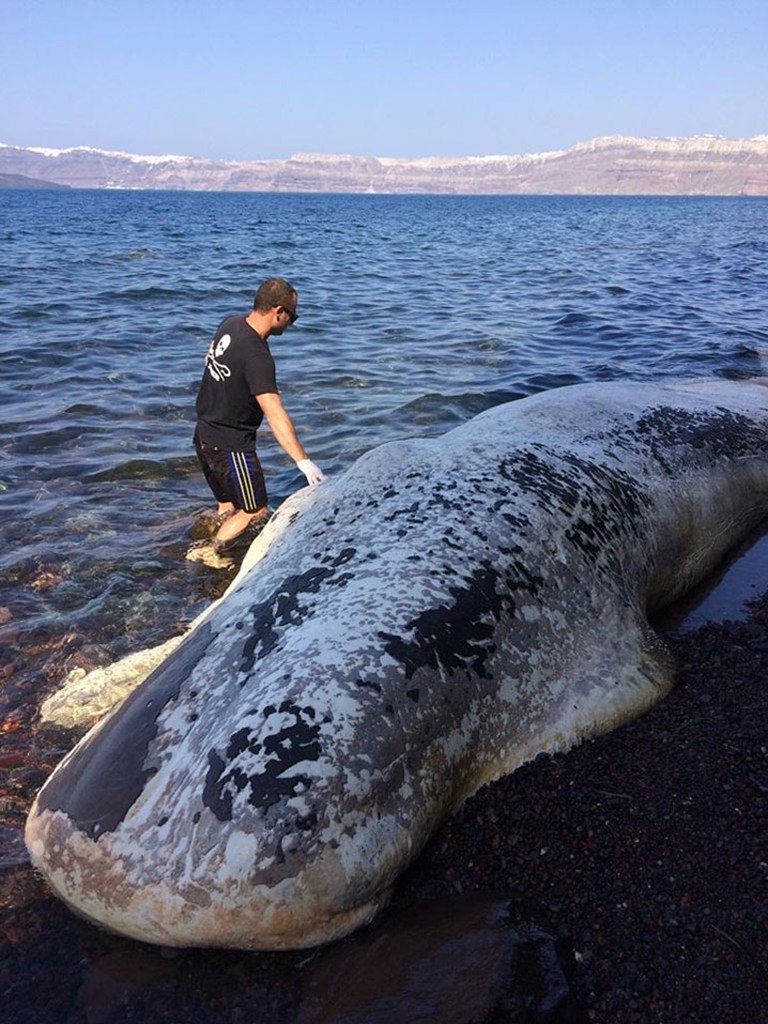 Μία νεκρή φάλαινα μήκους 9 μέτρων (Sperm whale) ξεβράστηκε στην περιοχή του Ακρωτηρίου στη Σαντορίνη.