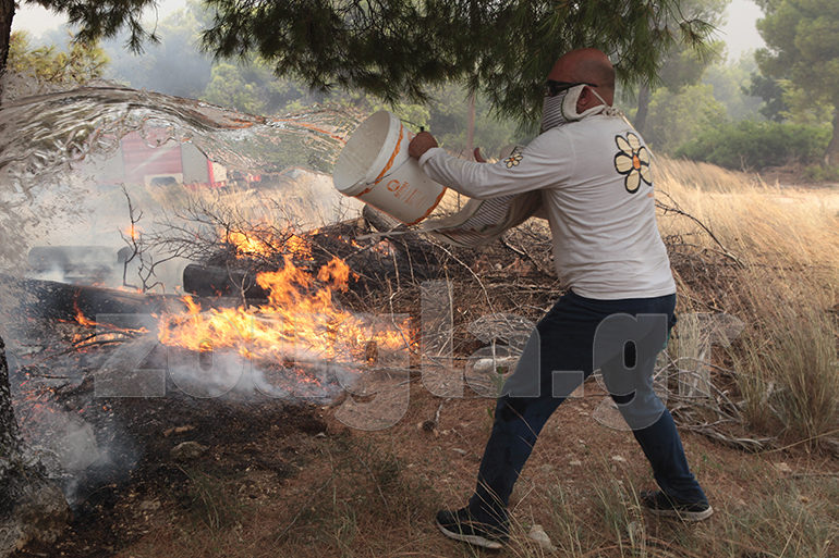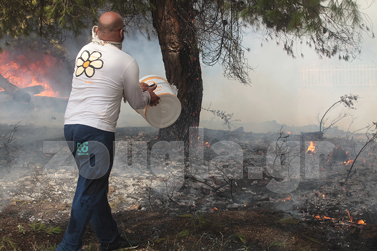 Κάτοικοι με λάστιχα, μάνικες και ό,τι άλλα μέσα διαθέτουν συνδράμουν στην πυρόσβεση, προκειμένου να σώσουν τις περιουσίες τους.