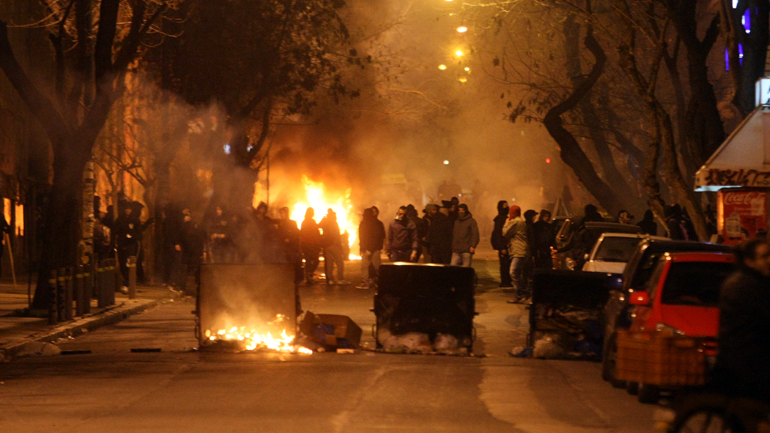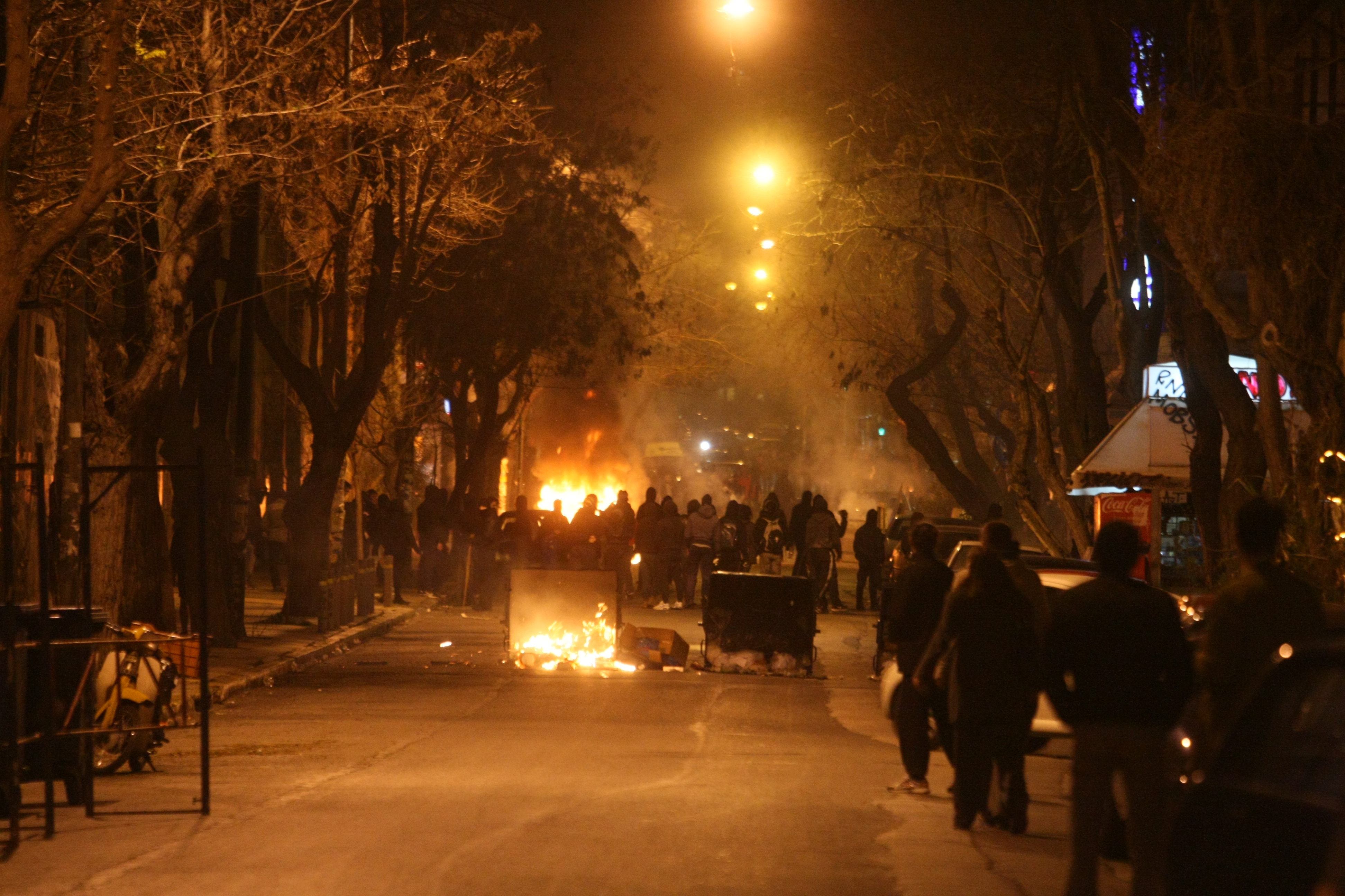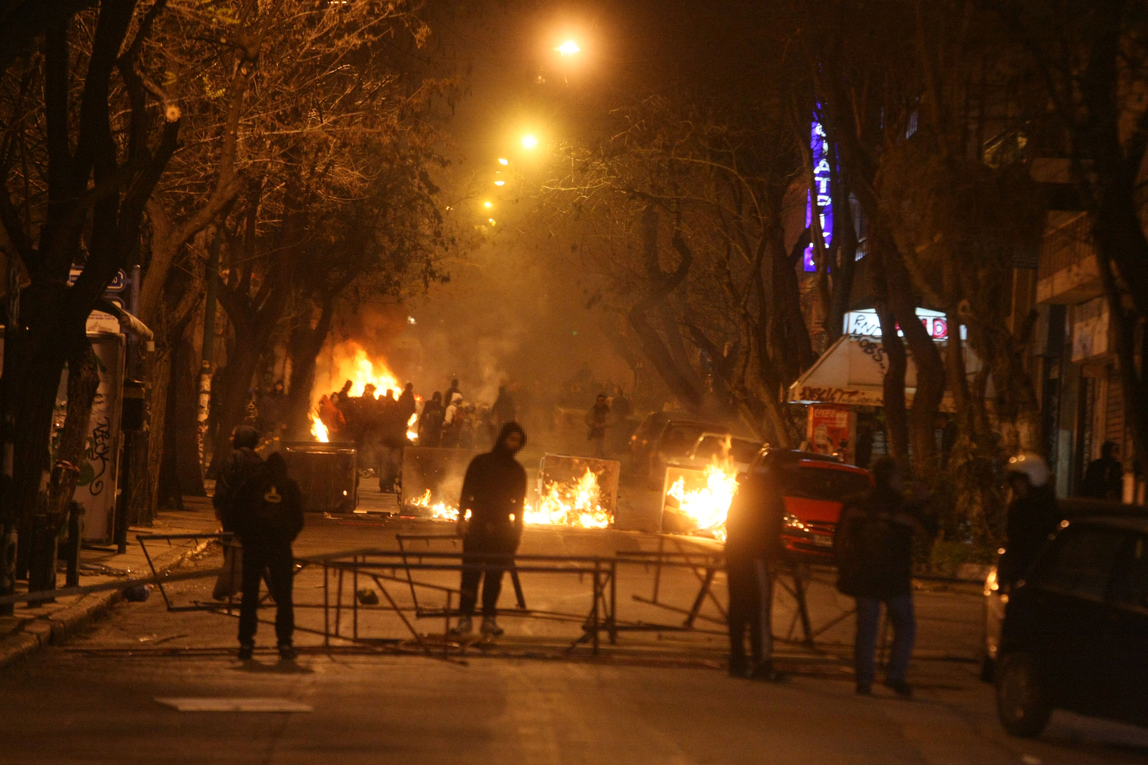 Τα επεισόδια επεκτάθηκαν στην περιοχή των Εξαρχείων όπου ομάδες νεαρών έβαλαν φωτιές σε κάδους απορριμμάτων στήνωντας αυτοσχέδια οδοφράγματα.