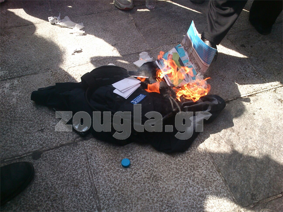Στη συνέχεια, κάποιοι εξ αυτών έβαλαν φωτιά στο μπουφάν και το γιλέκο του αστυνομικού.