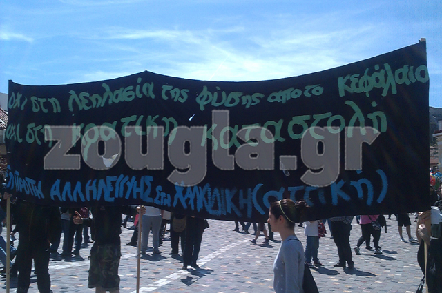 Στο Μοναστηράκι συγκεντρώθηκαν περίπου 2.000 άτομα, μέλη των επιτροπών κατά των μεταλλείων χρυσού στη Χαλκιδική και αντιεξουσιαστές. Στις 13.35 ξεκίνησε η πορεία τους προς το Σύνταγμα.