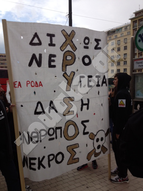 Οι διαμαρτυρόμενοι επέλεξαν έναν πρωτότυπο τρόπο για να εκφράσουν την αντίθεσή τους στην εξόρυξη χρυσού στην Χαλκιδική, κρατώντας έναν επιτάφιο φτιαγμένο από «λίγα μόνο δέντρα από τα χιλιάδες που κόβονται στις Σκουριές» όπως αναφέρουν χαρακτηριστικά.