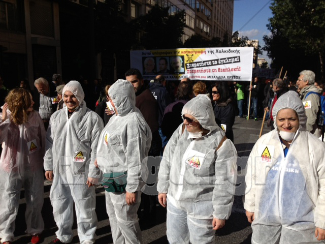Ορισμένοι από τους διαδηλωτές, μάλιστα, φορούσαν στολές για προστασία από τοξικά απόβλητα, τις οποίες χρησιμοποιούν οι εργαζόμενοι στα μεταλλεία.