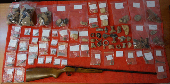 – 224 αρχαία αντικείμενα, όπως λυχνάρια, όστρακα, οψιδιανό κ.ά., τα οποία αποτελούν μέρος μεγαλύτερης συλλογής που φυλάσσονταν πλημμελώς