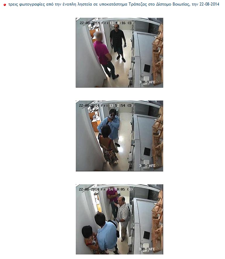 Οι δράστες κρατούσαν πιστόλια και είχαν καλυμμένα τα χαρακτηριστικά του προσώπου τους. Εισέβαλαν λίγο πριν από τις 13.55 στο υποκατάστημα της Εθνικής Τράπεζας στα Άσπρα Σπίτια Βοιωτίας στην περιοχή του Διστόμου. Αφού άρπαξαν περίπου 300.000 ευρώ, πήραν μαζί τους έναν ταμία της τράπεζας και επιβιβάστηκαν σ’ ένα μαύρο RAV, με το οποίο και διέφυγαν. Στο υποκατάστημα της Εθνικής εκείνη την ώρα βρίσκονταν 4-5 υπάλληλοι.