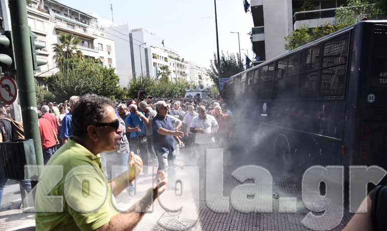 Με… χημικά υποδέχτηκαν τα ΜΑΤ επί της οδού Ηρώδου Αττικού τους συνταξιούχους που ξεκίνησαν πορεία διαμαρτυρίας από την πλατεία Κοτζιά.