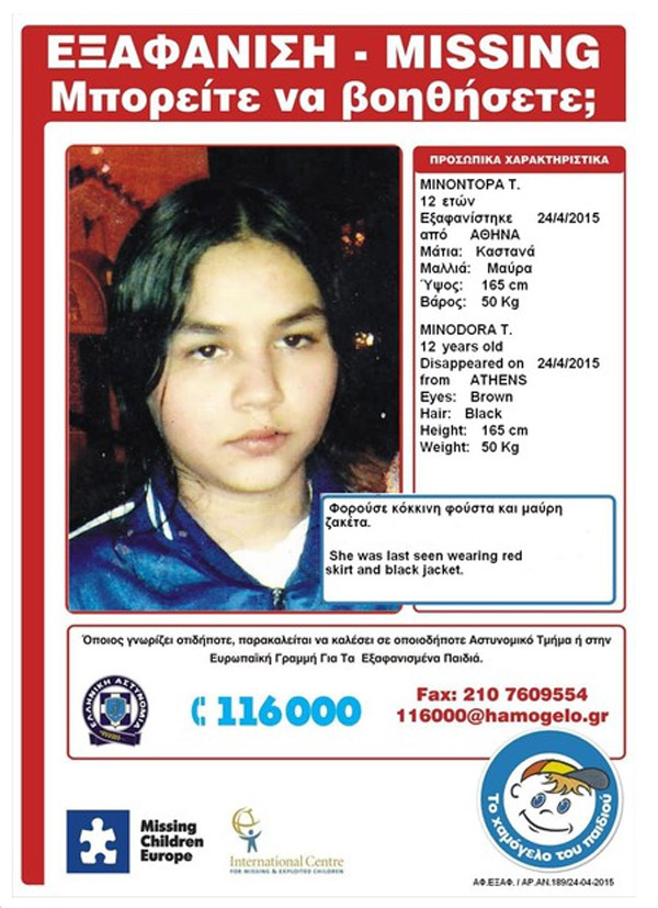 Σε συναγερμό έχουν τεθεί οι αρχές έπειτα από την εξαφάνιση ενός ακόμη παιδιού από στην Αθήνα. Σύμφωνα με ανακοίνωση από το «Χαμόγελο του Παιδού»: Στις 24/04/2015 στις 10:00 το πρωί, εξαφανίστηκε η Μινοντόρα Τ., 12 ετών από το σπίτι της στην περιοχή του Αγίου Παντελεήμονα στην Αθήνα.