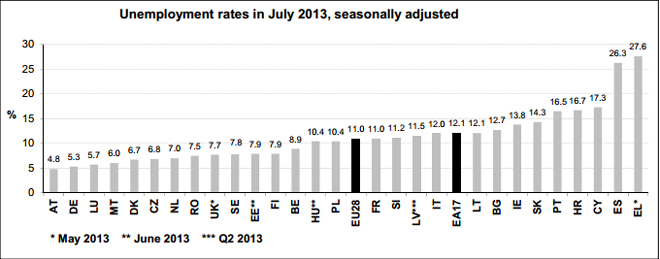 Οι χώρες στις οποίες καταγράφηκε η μεγαλύτερη αύξηση της ανεργίας σε ένα έτος ήταν η Κύπρος (από 12,2% σε 17,3%), η Ελλάδα (από 23,8% σε 27,6%) και η Σλοβενία (από 9,3% σε 11,2%).