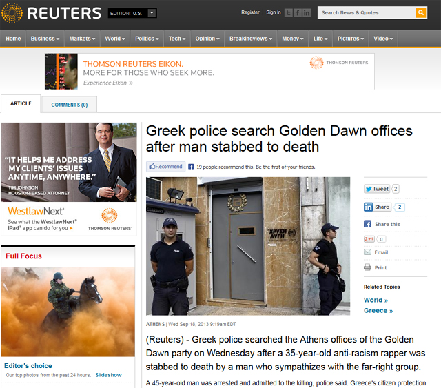 Το πρακτορείο Reuters σε δημοσίευμά του με τίτλο «Η ελληνική αστυνομία πραγματοποιεί έρευνες μετά τη δολοφονία ενός άνδρα με μαχαίρι», αναφέρει: Η αστυνομία στην Ελλάδα, έψαξε τα γραφεία της Χρυσής Αυγής στην Αθήνα, μετά από τη δολοφονία ενός 35χρονου αντιρατσιστή ράπερ, ο οποίος μαχαιρώθηκε μέχρι θανάτου από έναν άντρα προσκείμενο στο ακροδεξιό κόμμα.