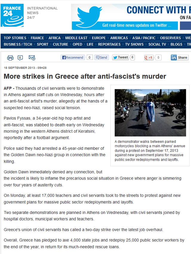 Στο ίδιο μήκος κύματος και η αγγλική έκδοση του γαλλικού δικτύου France24, τονίζει μεταξύ άλλων ότι η Χρυσή Αυγή αρνήθηκε κάθε σύνδεση με το περιστατικό, το οποίο «αναμένεται να πυροδοτήσει κοινωνική αναταραχή στην Ελλάδα, όπου τα μέτρα λιτότητας έχουν προκαλέσει οργή».