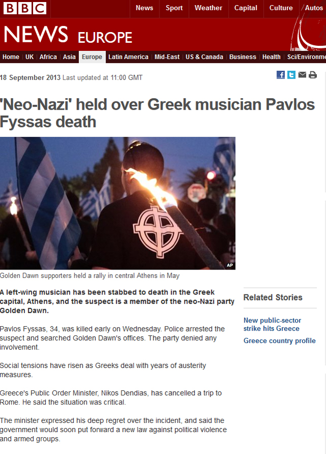 Το βρετανικό BBC ανέφερε μεταξύ άλλων ότι ο 34χρονος δολοφονήθηκε από ένα «μέλος του νεοναζιστικού κόμματος Χρυσή Αυγή» και απέδωσε το περιστατικό στην κοινωνική κρίση που έχει ξεσπάσει στην Ελλάδα, μετά την επιβολή των σκληρών μέτρων λιτότητας.