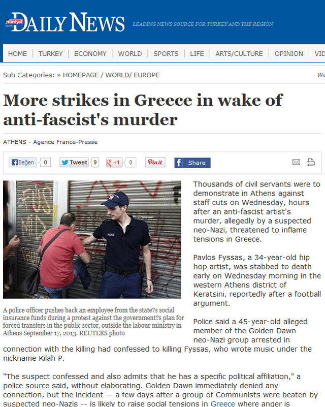 Τον γύρο του κόσμου κάνει μέσω διαδικτύου η είδηση της δολοφονίας του 34χρονου μουσικού Παύλου Φύσσα.
