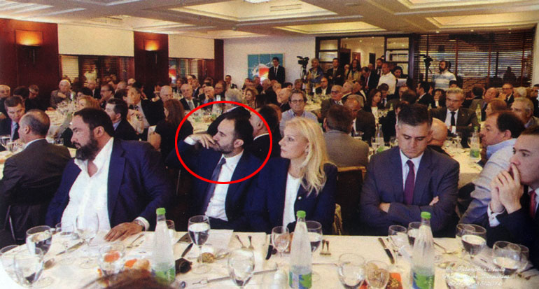 (Ο κ. Μαρινάκης μαζί με τον κ. Ευάγγελο Μπαϊρακτάρη στη Ναυτιλιακή Λέσχη Πειραιώς κατά τη διάρκεια ομιλίας του Κυριάκου Μητσοτάκη στις 22 Μαΐου 2017)