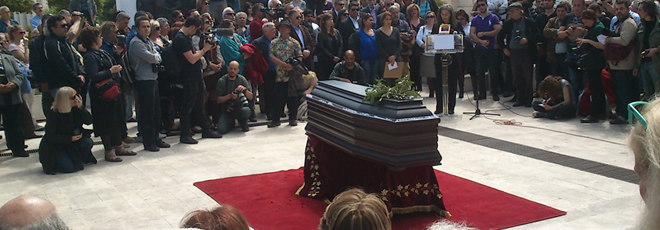 Ολοκληρώθηκε λίγο μετά τις 15.00 το μεσημέρι από το Α’ Νεκροταφείο Αθηνών η πολιτική κηδεία του 77χρονου συνταξιούχου φαρμακοποιού, Δημήτρη Χριστούλα, ο οποίος το πρωί της περασμένης Τετάρτης αυτοκτόνησε στην πλατεία Συντάγματος. Σύμφωνα με δική του επιθυμία, η σορός του θα μεταφερθεί στη Βουλγαρία για να αποτεφρωθεί. Στο τέλος της κηδείας ο Μίλτος Πασχαλίδης ερμήνευσε ένα τραγούδι του Μ. Θεοδωράκη.