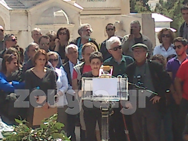 Διαβάστηκε ένα μήνυμα του Μίκη Θεοδωράκη και στη συνέχεια τον λόγο πήρε η Σοφία Σακοράφα, στην οποία εργαζόταν η κόρη του αυτόχειρα. Μίλησε ο πρόεδρος του Πολιτιστικού Συλλόγου Αμπελοκήπων, η κόρη του, Έμμυ, καθώς και φίλοι και συνάδελφοι.
