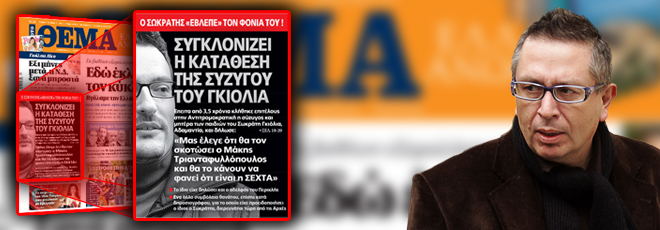 Με πρωτοσέλιδό της η εφημερίδα «Πρώτο Θέμα» του πασίγνωστου για τις πάσης φύσεως αθλιότητες εκδότη Θέμου Αναστασιάδη εμπλέκει τον δημοσιογράφο Μάκη Τριανταφυλλόπουλο στην υπόθεση της εκτέλεσης του Σωκράτη Γκιόλια από την οργάνωση «Σέχτα Επαναστατών».