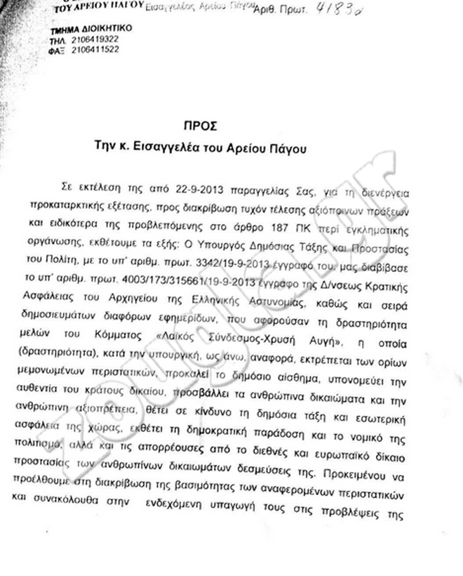 Στο φως της δημοσιότητας ήρθε το πόρισμα του αντιεισαγγελέα του Αρείου Πάγου Χαράλαμπου Βουρλιώτη για τη δομή και λειτουργία της Χρυσής Αυγής.