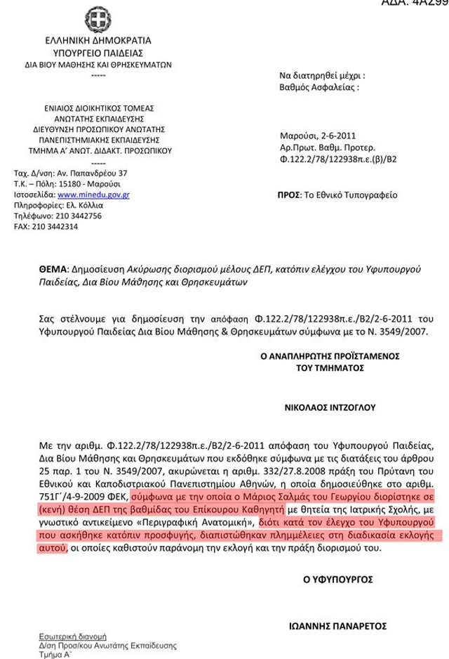 Στις 2-6-2011, ο τότε υφυπουργός Παιδείας Ιωάννης Πανάρετος, με την 122938/2-6-2011 απόφασή του, ακυρώνει τον τίτλο του κ. Σαλμά (κατά την απόφαση) με το αιτιολογικό ότι «διαπιστώθηκαν πλημμέλειες στη διαδικασία εκλογής αυτού, οι οποίες καθιστούν παράνομη την εκλογή και την πράξη διορισμού του».