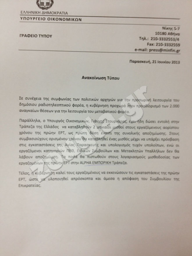 Παράλληλα, ο υπουργός Οικονομικών, Γιάννης Στουρνάρας, έδωσε εντολή στην Τράπεζα της Ελλάδος να καταβληθούν δύο μηνιαίοι μισθοί στους εργαζόμενους αορίστου χρόνου της πρώην ΕΡΤ, ως πρώτη δόση έναντι της συνολικής αποζημίωσης. Τα χρήματα πιστώθηκαν ήδη από το μεσημέρι της Παρασκευής στους λογαριασμούς των εργαζομένων.