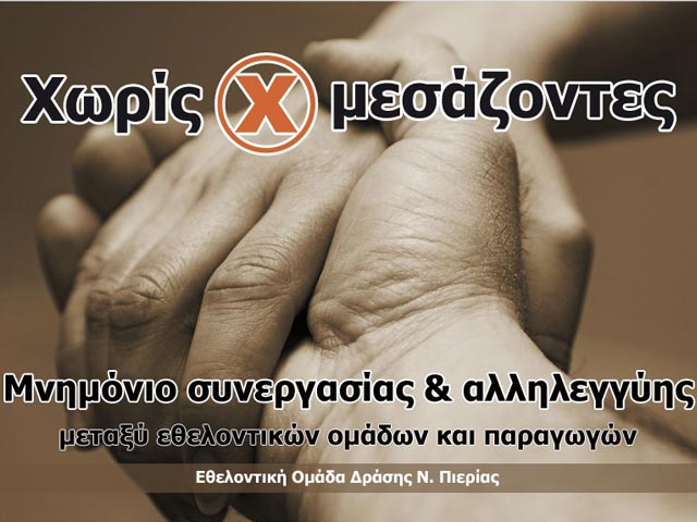 Η συνάντηση των πρωτοβουλιών «Χωρίς μεσάζοντες» στην Κατερίνη έχει ως στόχο να προσφέρει ένα πεδίο ανταλλαγής ιδεών, όπου ο ένας θα μάθει από τον άλλο, όπου ο καθένας θα σκύψει πάνω από τα πραγματικά ζητήματα που απασχολούν τον συμπολίτη του και κατ’ επέκταση τον ίδιο, μακριά από την οπτική που η επίσημη εξουσία θέλει να προβάλλει.