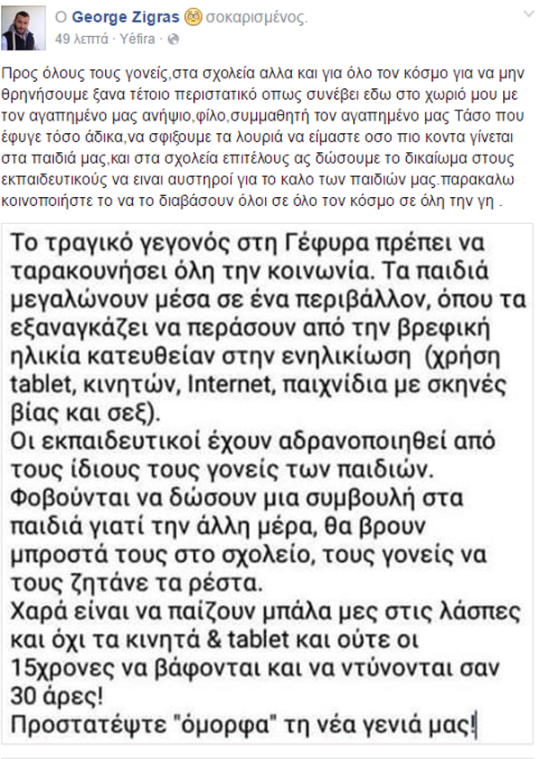Να προστατέψουμε «όμορφα» τη νέα γενιά μας προτρέπει μέσω ενός μηνύματος στο Facebook ο θείος του 14χρονου Τάσου, ο οποίος δολοφονήθηκε από συνομήλικο φίλο του την Κυριακή στη Γέφυρα Θεσσαλονίκης.