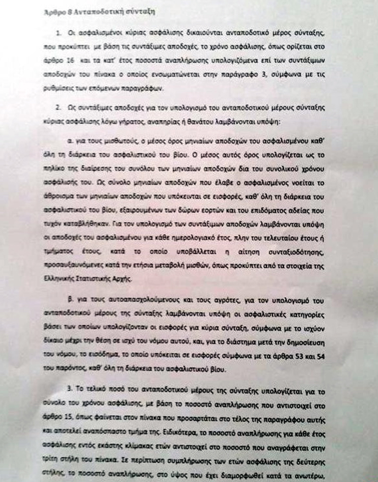 – Ο επανυπολογισμός των συντάξεων με νέους συντελεστές αναπλήρωσης για όλα τα χρόνια του εργασιακού βίου. Αυτό θα οδηγήσει σε σημαντικές μειώσεις συντάξεων σε όσους συνταξιοδοτηθούν από εδώ και στο εξής. Για τους παλιούς συνταξιούχους θα υπάρχει πρόβλεψη της «προσωπικής διαφοράς» έτσι ώστε να μη μειωθεί η κύρια σύνταξη τους μετά από τον νέο υπολογισμό.