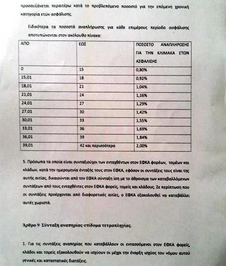 Αποσκοπώντας στη διασφάλιση των συντάξεων και προκειμένου να επιτευχθούν οι μνημονιακοί στόχοι, προβλέφθηκε αύξηση των εισφορών επικουρικής ασφάλισης κατά 1,5%, επιμεριζόμενης σε 1% για τους εργοδότες και 0,5% για τους εργαζόμενους.