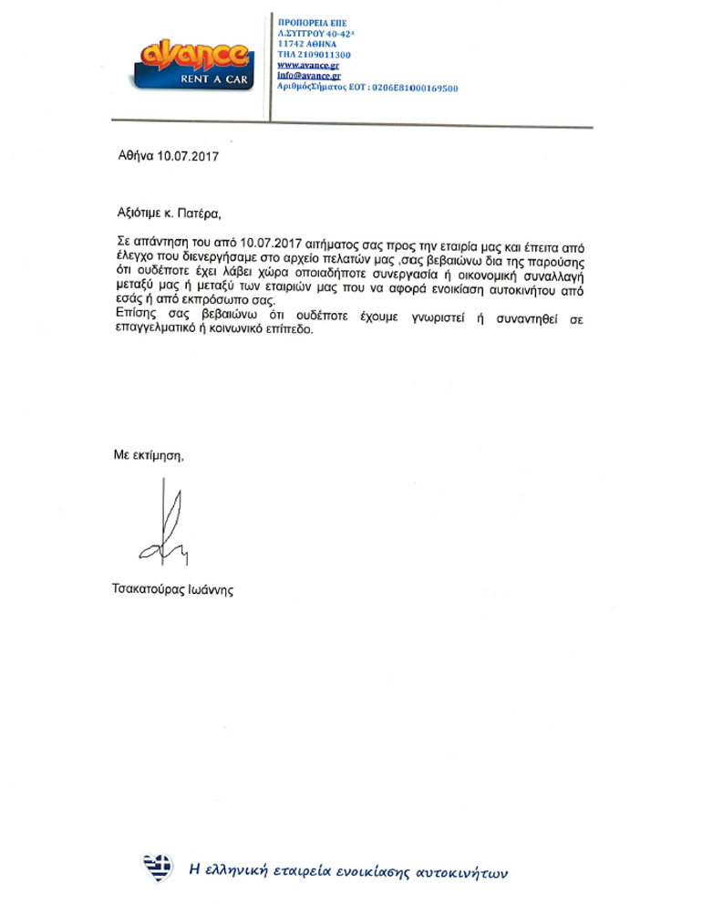 Δείτε τώρα την επιστολή που απέστειλε η «Avance» στον εφοπλιστή Νίκο Πατέρα με την οποία παρέχονται όλες οι διαβεβαιώσεις πως μηδέποτε υπήρξε οικονομική συναλλαγή της εταιρείας με τον εφοπλιστή ή κάποια από τις εταιρείες του και πως δεν υφίσταται κανενός είδους γνωριμία, επιχειρηματικού ή κοινωνικού επιπέδου, μεταξύ του ιδιοκτήτη της «Avance» και του εφοπλιστή.