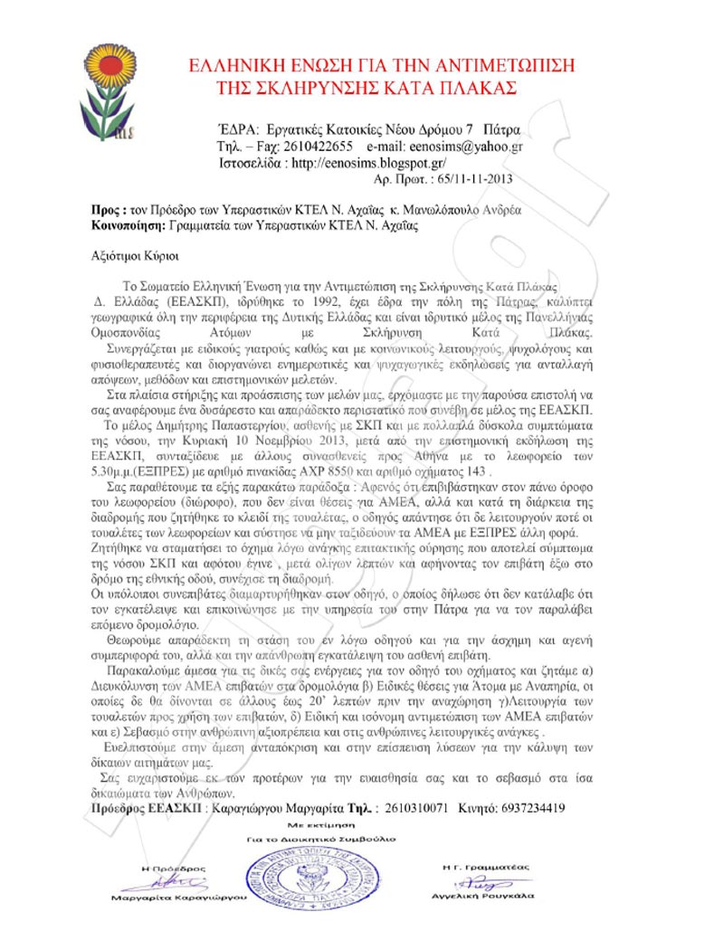 Έγγραφη διαμαρτυρία για το περιστατικό έχει υποβάλει και το σωματείο «Ελληνική Ένωση για την Αντιμετώπιση της Σκλήρυνσης Κατά Πλάκας Δ. Ελλάδας»: