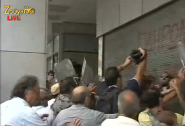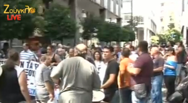 Λίγο μετά τις 12.30 σημειώθηκε ένταση με δυνάμεις των ΜΑΤ να απωθούν τους συγκεντρωθέντες.