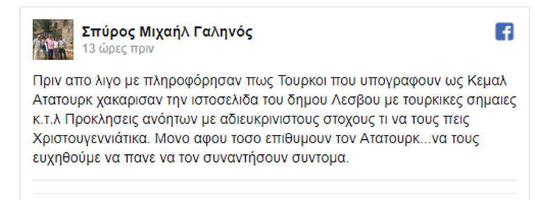 «Πριν απο λιγο με πληροφόρησαν πως Τούρκοι που υπογραφούν ως Κεμαλ Ατατουρκ χακαρισαν την ιστοσελίδα του δημου Λεσβου με τούρκικες σημαίες κ.τ.λ Προκλήσεις ανόητων με αδιευκρίνιστους στοχους τι να τους πεις Χριστουγεννιάτικα. Μονο αφου τοσο επιθυμούν τον Ατατουρκ…να τους ευχηθούμε να πανε να τον συναντήσουν σύντομα».