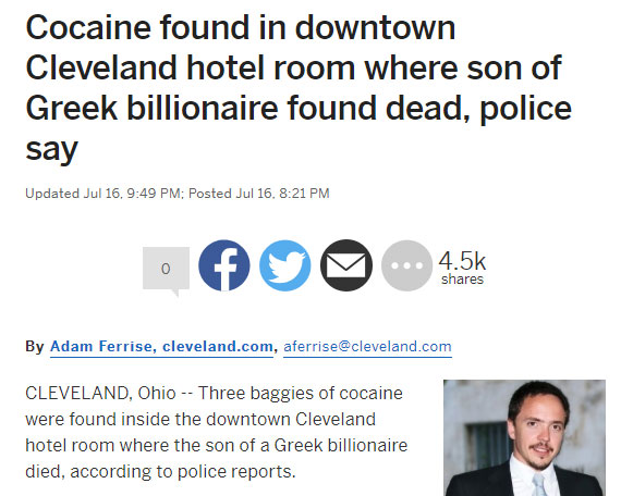 Σύμφωνα με τις αστυνομικές αναφορές, ο Κόκκαλης Junior έμενε στο ξενοδοχείο Mariott στο κέντρο του Κλίβελαντ, όταν στις 14.45 το μεσημέρι του Σαββάτου κλήθηκε η αστυνομία καθώς και ένα ασθενοφόρο να σπεύσουν στην περιοχή έπειτα από αναφορά για εντοπισμό πτώματος. Κατά τους αστυνομικούς που ασχολούνται με την υπόθεση, ο 34χρονος είχε πεθάνει 12 ώρες προτού εντοπιστεί.