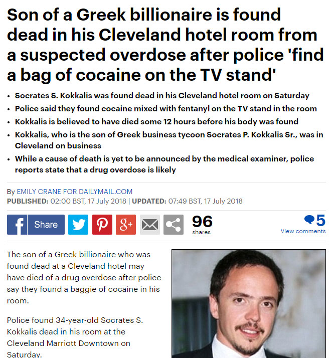 Αναφορά στον θάνατο του Σωκράτη Κόκκαλη Junior και στον εντοπισμό κοκαΐνης στο δωμάτιό του, έκανε και η βρετανική εφημερίδα Daily Mail.