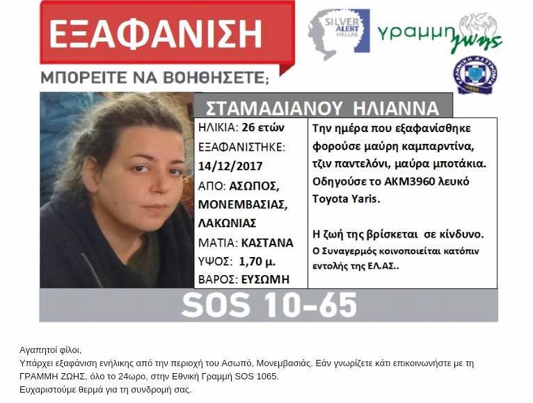 Τραγική κατάληξη είχε η εξαφάνιση της 26χρονης Ηλιάννας Σταμαδιανού που απασχολούσε τις τελευταίες μέρες τις Αρχές.Αγνοούνταν από τα ξημερώματα της Πέμπτης 14 Δεκεμβρίου από τον Ασωπό Λακωνίας.Εντοπίστηκε σε γκρεμό, νεκρή, μέσα στο αυτοκίνητό της, βυθίζοντας σε ατελείωτο θρήνο την οικογένειά της.