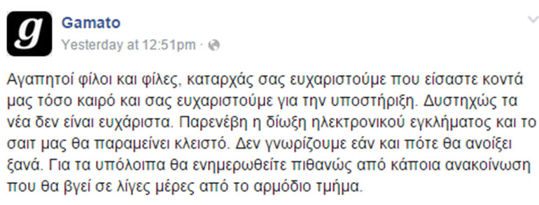 Το κλείσιμο της ιστοσελίδας με ταινίες και σειρές online, ανακοίνωσαν οι ίδιοι οι διαχειριστές στη σελίδα του Gamato στο facebook. Είναι η δεύτερη φορά που η ιστοσελίδα κατεβαίνει μετά από παρέμβαση της Δίωξης Ηλεκτρονικού Εγκλήματος.