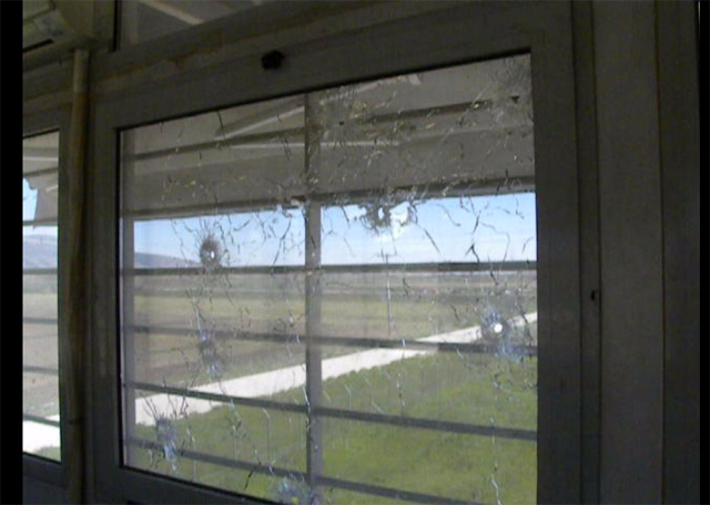 (Σπασμένα τζάμια από τους πυροβολισμούς)