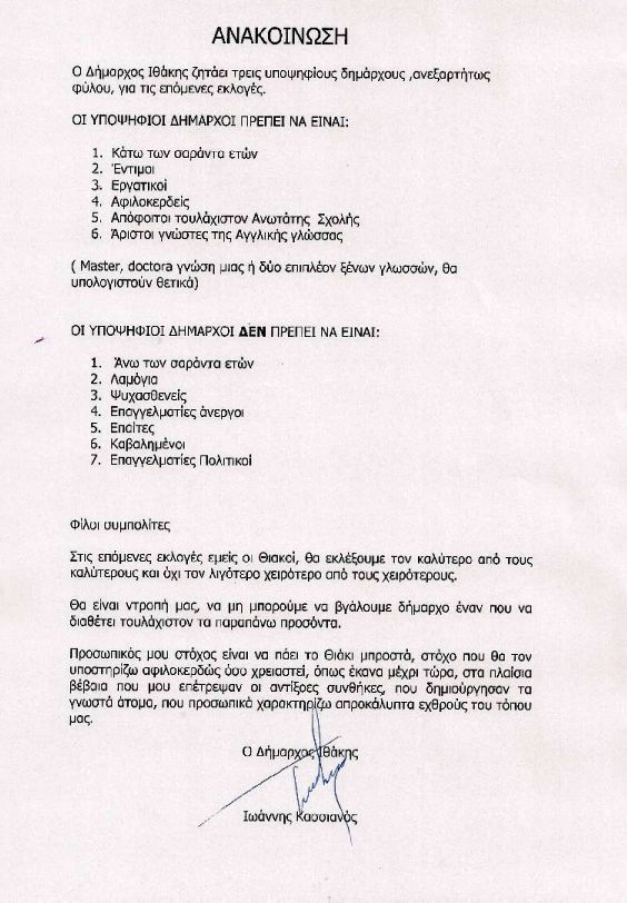 Με έγγραφο – ανακοίνωση, που ανήρτησε στην ιστοσελίδα του δήμου Ιθάκης ο «τοπικός άρχων», Ι. Κασσιανός, ζητεί τρεις υποψήφιους δημάρχους, ανεξαρτήτως φύλλου, οι οποίοι θα πρέπει να έχουν τις εξής προδιαγραφές: