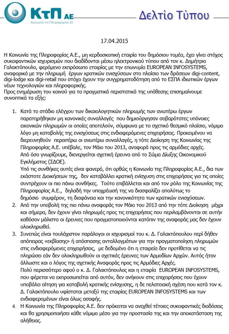Ωστόσο, όπως κατήγγειλε σε συνέντευξη Tύπου ο κ. Γαλακτόπουλος, το Διοικητικό Συμβούλιο της ΚτΠ, κατά παράβαση του κανονισμού λειτουργίας της, προφασιζόμενο καταγγελίες από αγνώστους, αποφάσισε τον Μάιο του 2013 να προσφύγει στο ΣΔΟΕ, κατηγορώντας τις επιχειρήσεις που έχουν συνεργασία με την European Infosystems για παρατυπίες, χωρίς όμως να ζητήσει από αυτές να προσκομίσουν σχετικά στοιχεία.