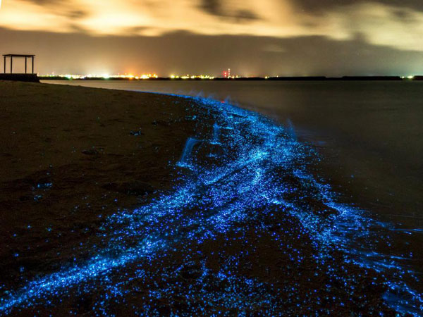 3. Το νερό που φωσφορίζει – Σε διάφορες παραλίες του κόσμου (Πόρτο Ρίκο, Μαλδίβες, Καλιφόρνια, Φλόριντα, Τογιάμα κ.α.), τα νερά λαμπυρίζουν το βράδυ, φαινόμενο που οφείλεται σε αμέτρητους οργανισμούς φυτοπλαγκτόν που παρουσιάζουν βιοφωταύγεια.