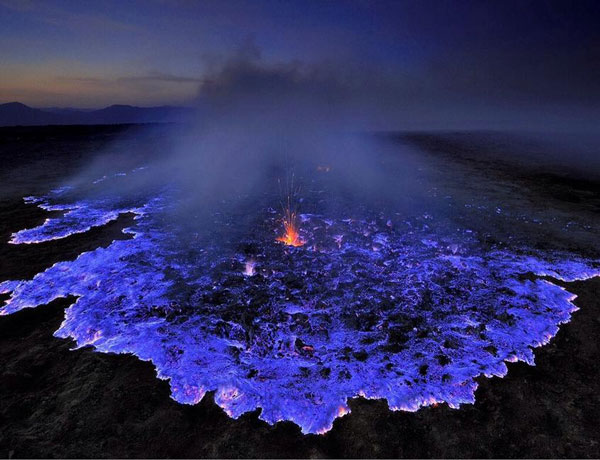 8. Το ηφαίστειο Kawah Ijen με την μπλε λάβα στην Ινδονησία – Το πρωί είναι ένα συνηθισμένο ηφαίστειο και το βράδυ μεταμορφώνεται σε μια φαντασμαγορική πηγή μπλε λάβας. Διαθέτοντας και τη μεγαλύτερη όξινη λίμνη θειικού οξέος στον κόσμο, το υγρό θείο που πυρακτώνεται αναδύεται από τον κρατήρα σε μπλε πύρινες γλώσσες.