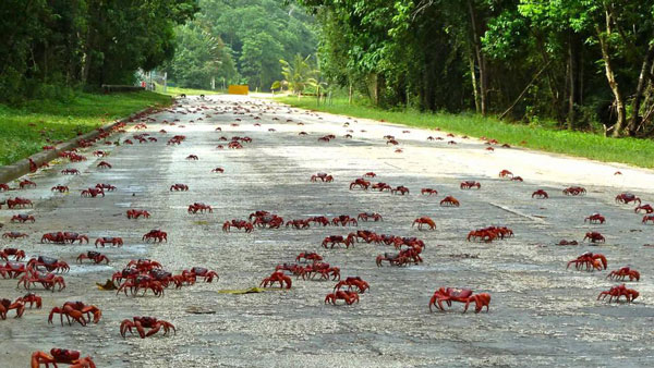 9. Τα κόκκινα καβούρια στο Νησί των Χριστουγέννων, στην Αυστραλία – Γύρω στα τέλη Νοεμβρίου πλημμυρίζουν τους δρόμους του νησιού με προορισμό τον Ινδικό Ωκεανό όπου γεννάνε τα αυγά τους.