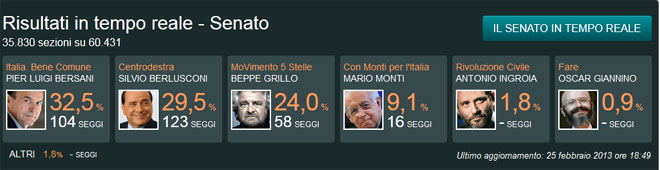 Στις 18.00 – ώρα Ιταλίας, τα πραγματικά αποτελέσματα που δίνονται στη δημοσιότητα από το υπουργείο Εσωτερικών της Ιταλίας, ανατρέπουν τις δεύτερες προβλέψεις. Ο Πιέρ Λουίτζι Μπερσάνι προηγείται του Σίλβιο Μπερλουσκόνι και στην Κάτω Βουλή, αλλά και στη Γερουσία. Ο συνασπισμός του «Καβαλιέρε» ακολουθεί δεύτερος και τρίτος μένει σταθερά ο Μπέπε Γκρίλο με ποσοστό της τάξης του 25%. Επισημαίνεται ότι οι έδρες στη Γερουσία όπου παίζεται και η κυβερνησιμότητα της Ιταλίας, δεν κατανέμονται επί αναλογικής βάσεως, αλλά ανάλογα με τα ποσοστά των κομμάτων στις περιφέρειες, ως εκ τούτου, στις 18.30 – ώρα Ιταλίας, ενώ η κεντροαριστερά προηγείται του Σ. Μπερλουσκόνι σε ποσοστά ψήφων, λάμβανε πολύ λιγότερες έδρες στη Γερουσία από τον συνασπισμό της δεξιάς. Πρόκειται για ένα εξαιρετικά πολύπλοκο σύστημα το οποίο στα ιταλικά αποκαλείται «porcellum».