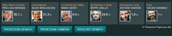 Σύμφωνα με τα αποτελέσματα που δόθηκαν στη δημοσιότητα στις 18.30 – ώρα Ιταλίας (19.30 – ώρα Ελλάδας) για το κοινοβούλιο, ο κεντροαριστερός συνασπισμός του Πιέρ Λουίτζι Μπερσάνι συγκεντρώνει το 33.3%, η συμμαχία Μπερλουσκόνι με το ακροδεξιό κόμμα «Λέγκα του Βορρά» το 25,3%, το κίνημα των 5 Αστεριών του Μπέπε Γκρίλο το 25,7% και ο κεντρώος συνασπισμός υπό τον Μάριο Μόντι περιορίζεται στο 10,2%.