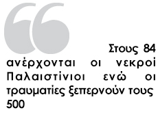 Η ισραηλινή πυραυλική ομοβροντία των 850 τόνων εκρηκτικών, που έρχεται σε συνέχεια των εχθροπραξιών των τελευταίων ημερών μεταξύ των μαχητών της Χαμάς και των Ισραηλινών, έχει χτυπήσει 750 «στρατηγικούς στόχους» κι ανεβάσει τον αριθμό των νεκρών στους 84, οι τραυματίες ξεπερνούν τους 500, οι περισσότεροι εκ των οποίων άμαχοι, ενώ δεν έχουν αναφερθεί θύματα από τις παλαιστινιακές ρουκέτες μεγάλου βεληνεκούς που εκτοξεύονται διαρκώς προς το ισραηλινό έδαφος.