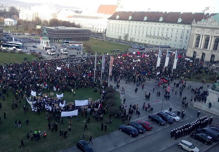 Οι διαδηλωτές, ανάμεσά τους και πολλοί νέοι, ήταν περικυκλωμένοι από ισχυρές δυνάμεις της αστυνομίας, η οποία οδήγησε την πορεία στην πλατεία των Ηρώων, όπου το 1938 ο Αδόλφος Χίτλερ εκφώνησε την ομιλία στην οποία ανακοίνωσε την προσάρτηση της Αυστρίας στη Γερμανία.