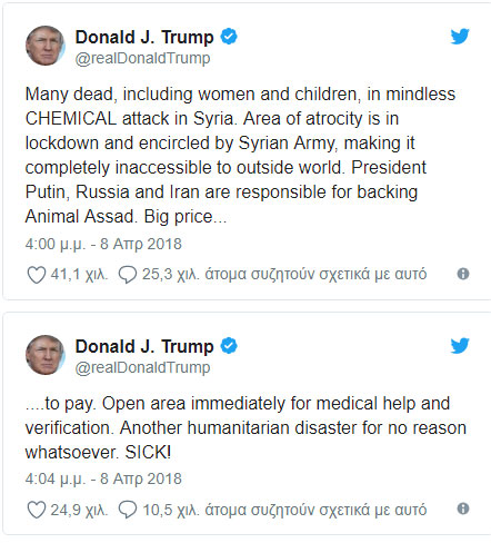 «Ο Μπαζάαρ Αλ Άσαντ θα πληρώσει βαρύ τίμημα για την χημική επίθεση η οποία συνιστά άλλη μία ανθρωπιστική καταστροφή που έγινε χωρίς κανέναν απολύτως λόγο» τονίζει ο Τραμπ, σε ανάρτησή του στο twitter.